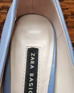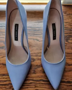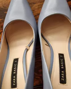 Zapatillas ZARA Basic Collection. Zapatillas fabricadas en piel, color azul plumazo o lavanda.Tacones de 4", corte de piel, forro piel, suela sintética. Usados 1 sola vez, calzado elegante en un color muy alegre y combinable.Tiene pequeños detalles en un tacón, que se observan en la 2a. fotografía, debido a que han permanecido mucho tiempo entre otros zapatos, sin embargo, el interior está impecable.