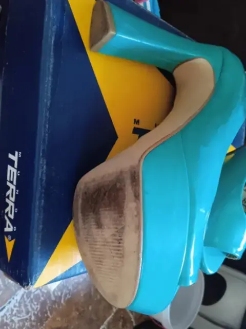 Zapato de tacón 👠. Bonitos zapatos de tacón, alto 13 cm., #5, de charol,color azul aqua, una sola puesta,en su caja original.