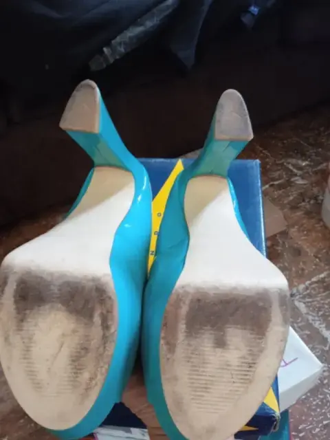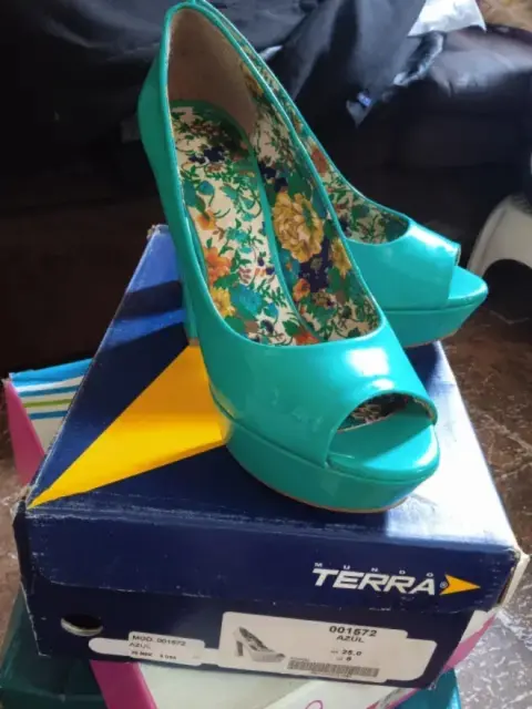 Bonitos zapatos de tacón, alto 13 cm., #5, de charol,color azul aqua, una sola puesta,en su caja original.