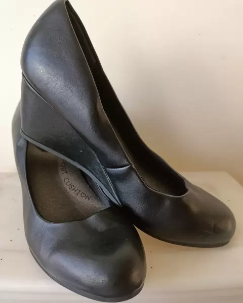Zapatillas de plataforma negros, puestos una sola vez número 8.5 americano, muy cómodos.Ojo tiene una ligera raspadura en uno de los tacones por la parte de atrás.