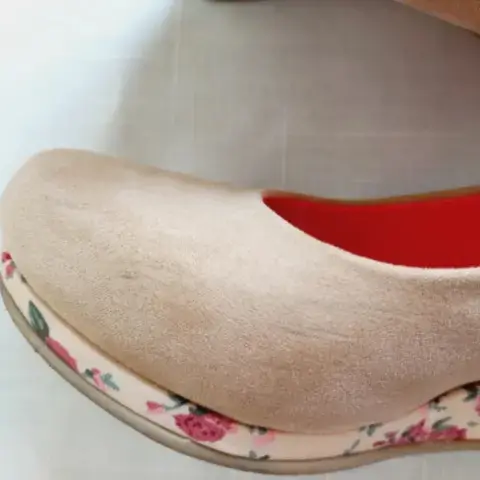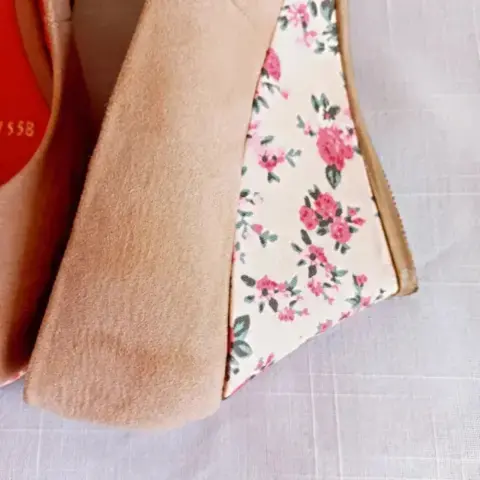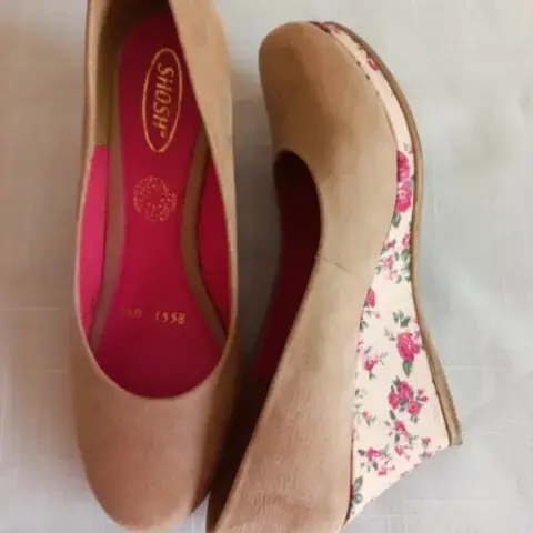 Bonitos zapatos color entre nude y cafecito de plataforma con de talle estampado en toda ella, tiene un detalle de marca casi imperceptible en uno de los zapatos