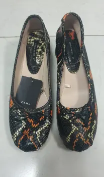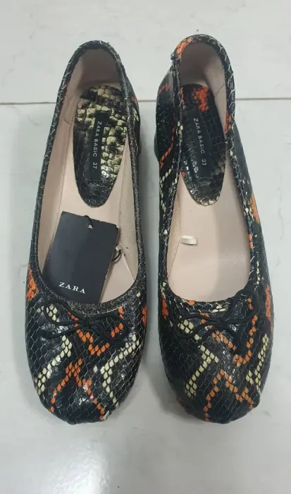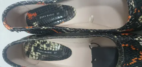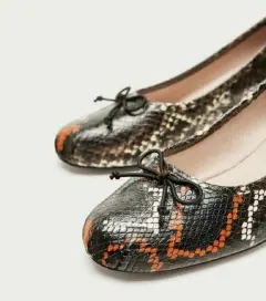 Zapatos de tacón bajo animal print de Zara. Zapatillas de animal print color negros con detalles naranja y beige. Son de piel, por lo tanto son super suaves, y muy cómodos. El tacon es circular, ancho y bajo. Son talla 37 nuevos y con etiqueta y sin detalles
