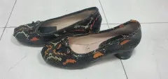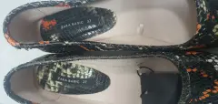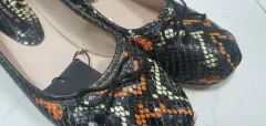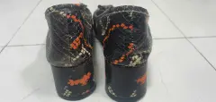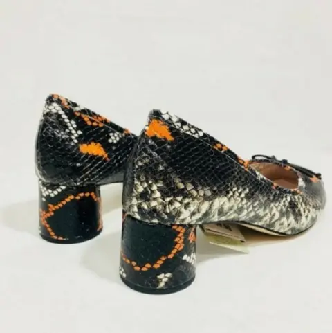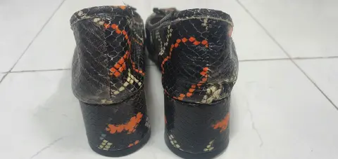 Zapatillas de animal print color negros con detalles naranja y beige. Son de piel, por lo tanto son super suaves, y muy cómodos. El tacon es circular, ancho y bajo. Son talla 37 nuevos y con etiqueta y sin detalles