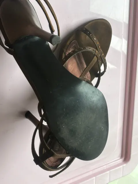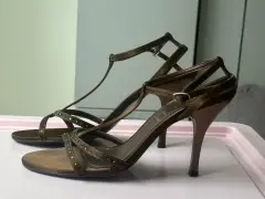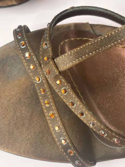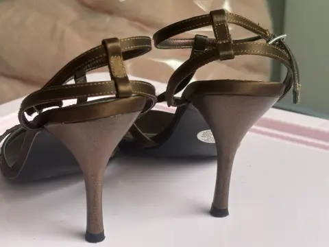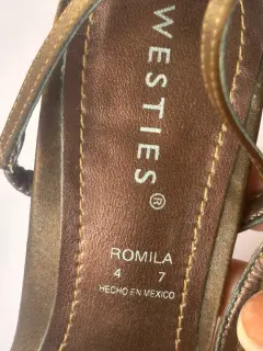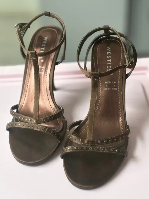Zapatos en buen estado , talla 4 , con pedrería discreta , material satinado café. Con tacón de 7 cm aproximadamente . Marca. Westies.