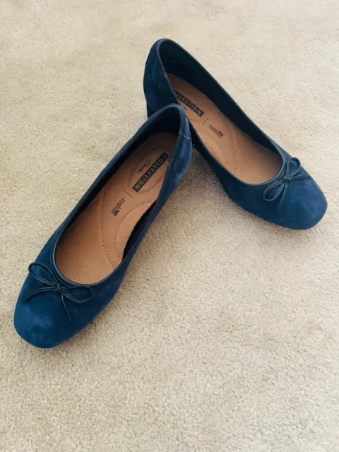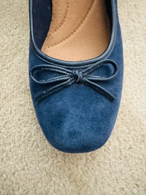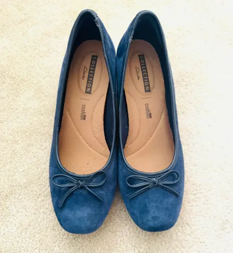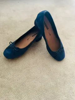 Los estilos clásicos como las ballerinas son para siempre! Bonitos zapatos de piel en color azul marino de ante. Con un poco de tacon para estilizar más las piernas. Con el detalle de un moñito al frente. Muy vestidores y de una marca emblemática. NOTA: son 7.5 W eso quiere decir que son anchos Wide. Perfectos para pies anchos. Más opciones en mi clóset. No mascotas y no fumadora.