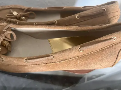 Son unos zapatos Michael Kors, en gamuza color camel, tipo mocasín, usados, originales, talla 27 mexicano