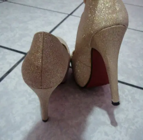 Zapatillas de tacón altas en buen estado y sin puestas, doradas con suela roja.