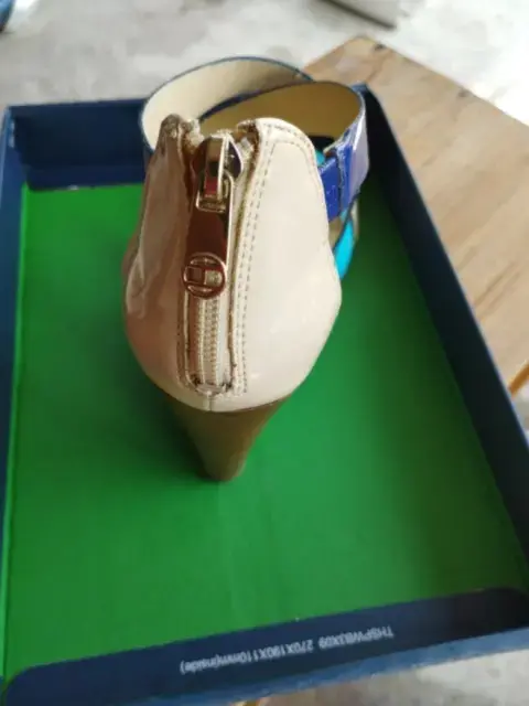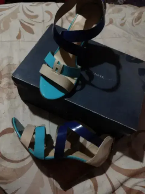 Zapatos Tommy Hilfiger, con correas azul marino y claro, y franjas beige tacón 8cm, cierre atrás sintético.