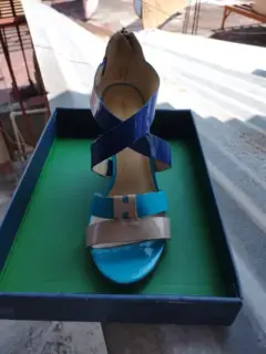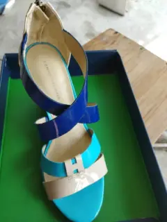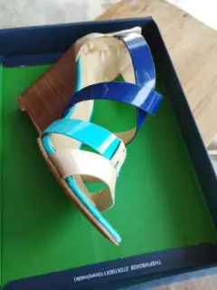 Zapatos Tommy Hilfiger. Zapatos Tommy Hilfiger, con correas azul marino y claro, y franjas beige tacón 8cm, cierre atrás sintético.