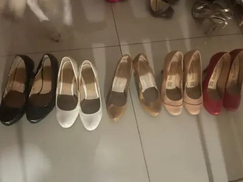 5 pares de zapatos de charol de color: rojo, blanco, negro, nude, y rosa. Tacón 6 ideal para oficina talla 23.5