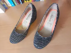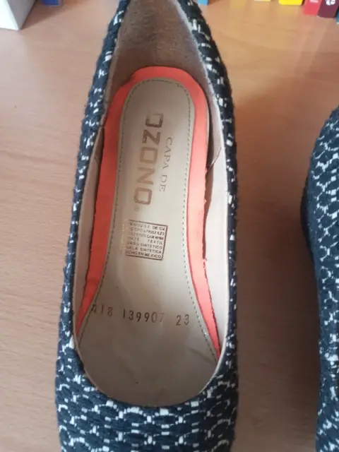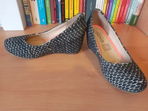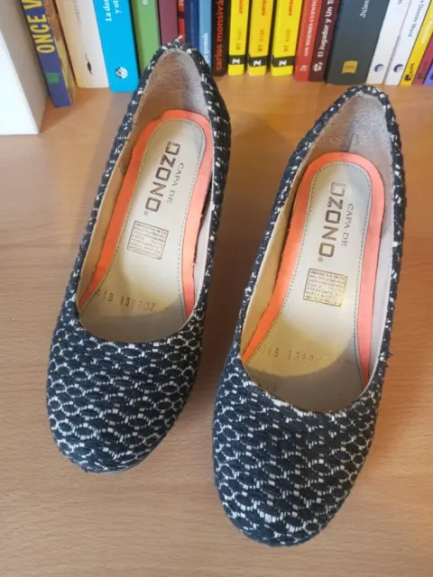 Zapatillas casuales, en color negro con blanco, de tela tipo pata de gallo. Punta cerrada. Tacón cuña, altura de la cuña medio 6.5 cm, talla US-6/ MEX 3Con su caja original. Puestos una vez
