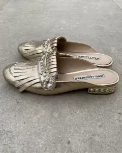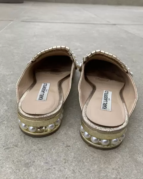 Mules dorados Karl Lagerfeld. Mules en tono dorado pálido, con aplicaciones de perlas. Son talla 4 y vienen un poco anchos, quedan muy cómodos para pie gordito. Les falta una perlita en un tacón y tienen un poco de desgaste en la plantilla por dentro.