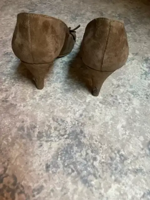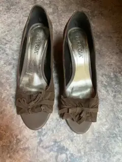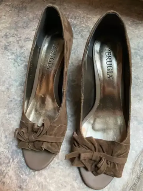Zapato abierto café de gamusa marca Perugia. Trae un adorno en la parte frontal, tacón bajo, cómodo y en perfecto estado. Es #5