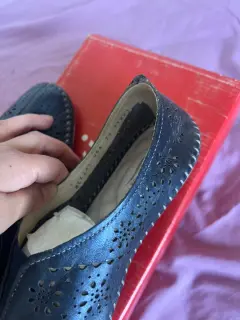 Zapatos planos, de piel, color azul fuerte. Talla 4 y medio. Usados pero en buen estado.