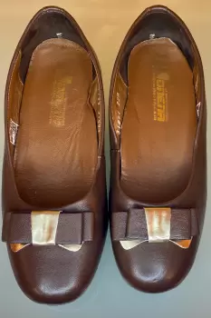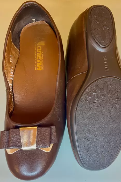 Zapatos Onena 7755 Café Con Moño. Forro de piel, plantilla acojinadaTiene tacón interno de 3 centímetrosAl frente tiene un moño de piel del mismo color con un remate en sintético que simula metal doradoEstán en bueno estado, no raspados
