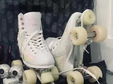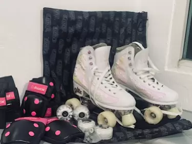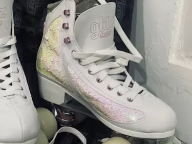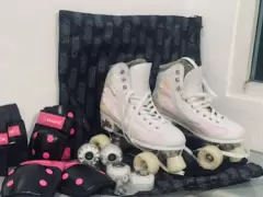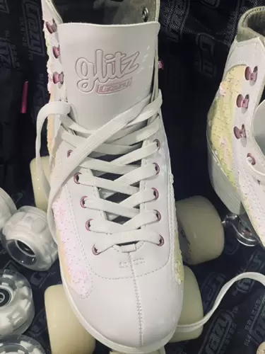 Patines De Ruedas Ajustables Para Mujer Talla 5 5 1/2 Mexicano.El patín de ruedas GLITZ . Sus botas altas blancas de estilo retro cuentan con exclusivos paneles de lentejuelas brillantes de dos tonos y cuellos acolchados con forro grueso y cómodo. Los patines se asientan sólidamente sobre camiones de aleación de alta calidad y placas de patines de aleación con bujes infundidos con brillo. (Entregó con equipo de coderas, rodilleras y repuestos de llantas también nuevas).