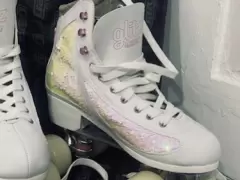 Patines Glitz.. Patines De Ruedas Ajustables Para Mujer Talla 5 5 1/2 Mexicano.El patín de ruedas GLITZ . Sus botas altas blancas de estilo retro cuentan con exclusivos paneles de lentejuelas brillantes de dos tonos y cuellos acolchados con forro grueso y cómodo. Los patines se asientan sólidamente sobre camiones de aleación de alta calidad y placas de patines de aleación con bujes infundidos con brillo. (Entregó con equipo de coderas, rodilleras y repuestos de llantas también nuevas).