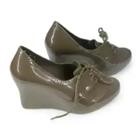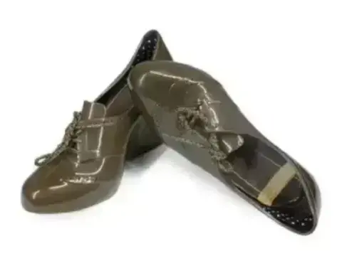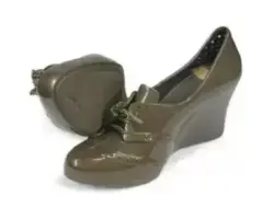 Zapatos cafés de plástico con agujeta al frente. Son con tacón corrido, súper lindo y combinables. Excelente para diversos outfits.