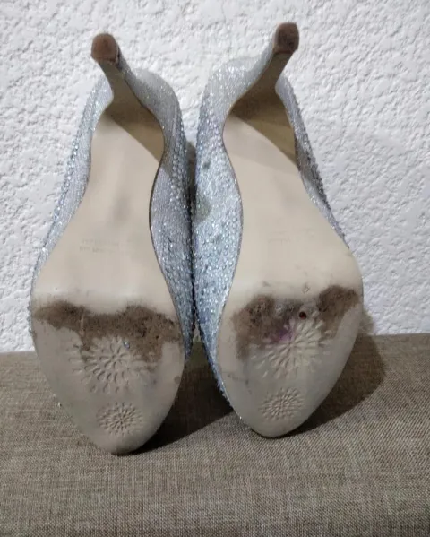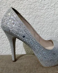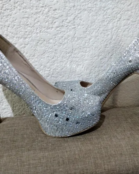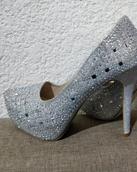 Zapatilla de plataforma color plata con efectos brillantes , número 6, corte sintético, forro sintético, suela sintética, tacón de 13 cm, utilizadas en 3 ocasiones, sin defecto alguno en la parte interna, el desgaste de la suela se visualiza en fotos.