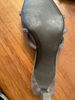 Zapatilla con 7 cms de tacón. Cubierta completamente en ante gris con aplicaciones . El zapato queda muy Justo a un número 23