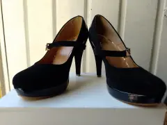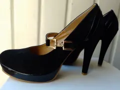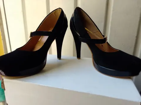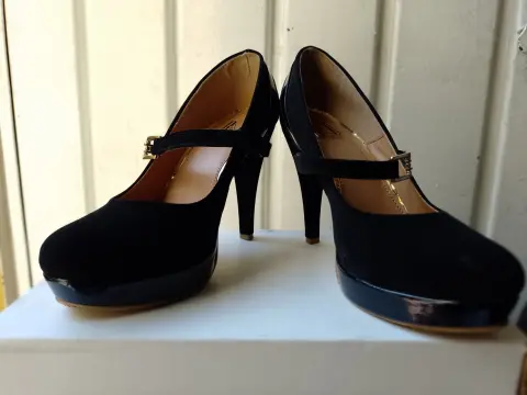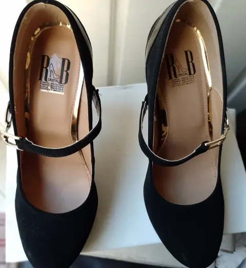 Zapatilla negra elegante. Zapatilla alta tipo ante elegante. El tacon mide 11cm de alto, tiene una cinta con un hermoso detalle. Estan en perfectas condiciones