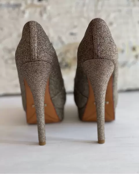 Zapatillas con plataforma color dorado (aunque trae combinación de colores) son muy prácticas y sirven casi con cualquier color.Talla: 23 (6 americano)Como referencia soy 3.5 y me quedan perfectos.El tacón mide 14 cm con todo y plataforma.Son zapatillas que han tenido uso, las conservo en buen estado y tienen detalles que se pueden apreciar en las fotos. Son detalles estéticos, no funcionales