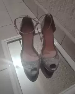 Son unas zapatillas de fiesta abiertas de la punta,color gris plata, con detalles de pedrería, ligeramente marcadas del tacón y de adentro un poco peladitas pero no afecta su uso.