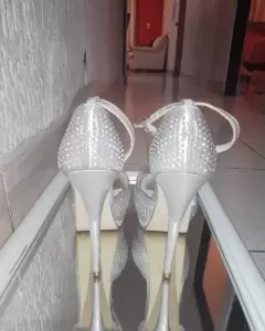 Zapatillas de fiesta. Son unas zapatillas de fiesta abiertas de la punta,color gris plata, con detalles de pedrería, ligeramente marcadas del tacón y de adentro un poco peladitas pero no afecta su uso.