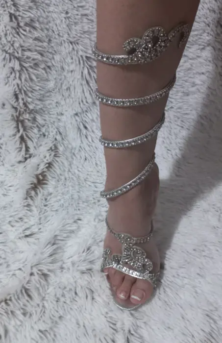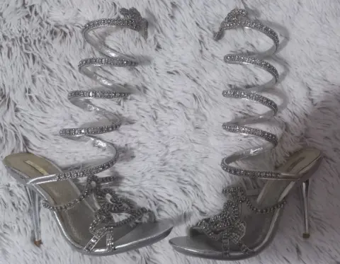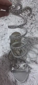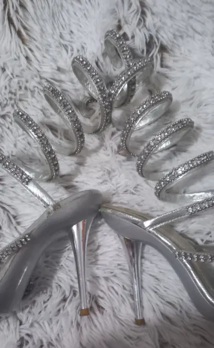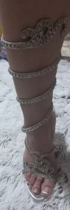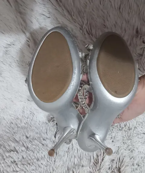 Zapatillas plata se ajustan a la pantorrillas no le falta ninguna piedra ,talla 25, vienen un poco amplias, se usaron pocas veces ,detalles de uso como se muestra en las fotos: de la suela esta un poco rayado lo plateado y una correa se esta medio descarapelando,pero no afecta su uso en lo mínimo.