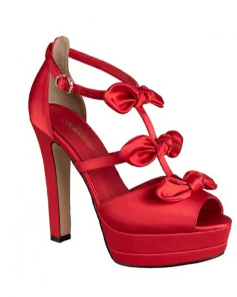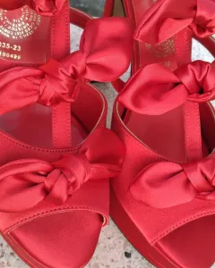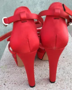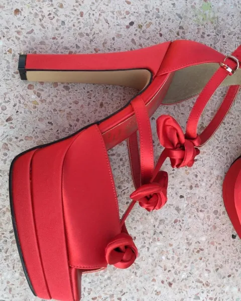 Zapatilla roja ,su tacón es del #12 .Se ven súper lindas ya que el material es de satín. En la parte de enfrente trae unos moñitos de adorno de verdad que te luces con unas zapatillas así de lindas.