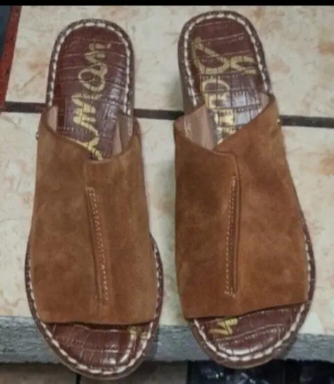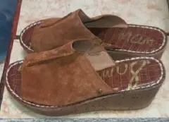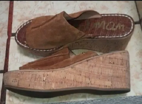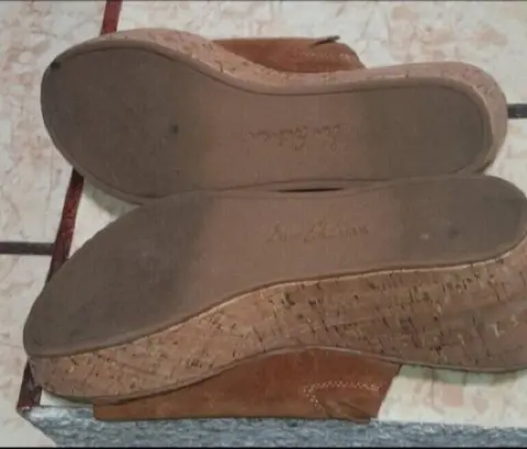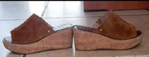 Lindos zuecos color marrón, talla 3, material,gamuza, plataforma de corcho, suela de goma, plataforma 7 y 3 cm, son usados ,están un poco pisados de la suela,lo demás viene en perfectas condiciones.