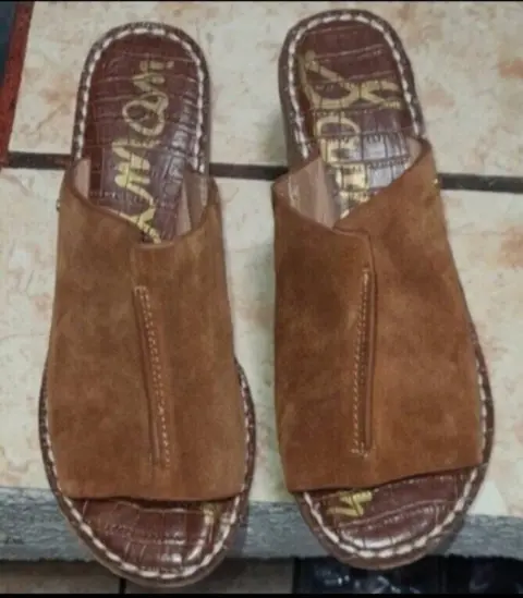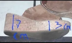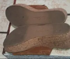 Lindos zuecos color marrón, talla 3cm, plataforma 7y3cm, material gamuza y corcho,tienen una puesta están en perfectas condiciones.